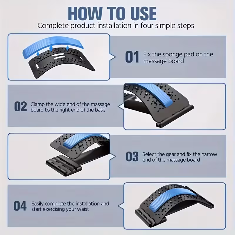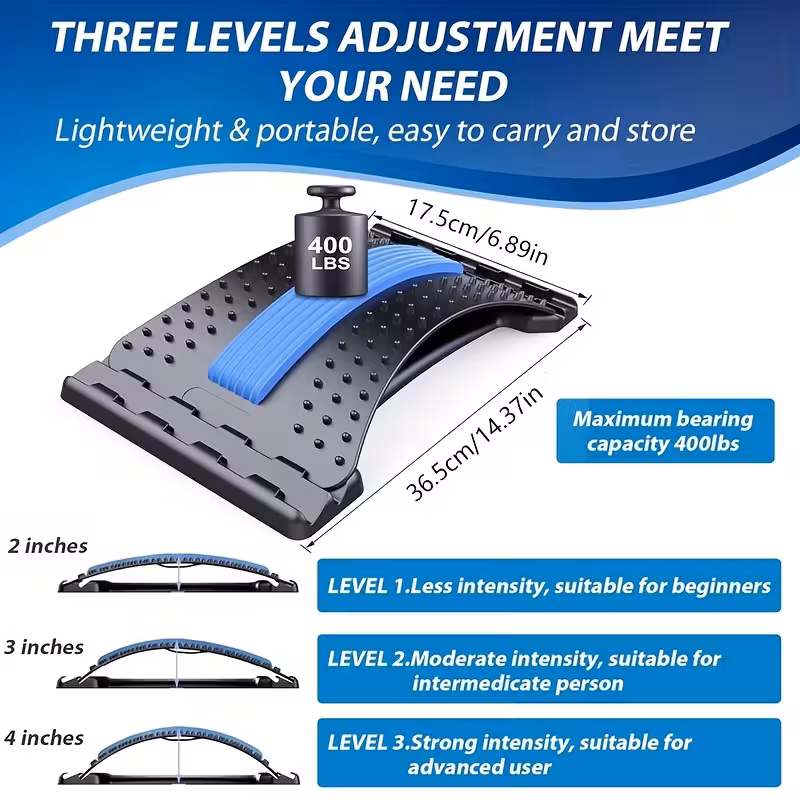 Support your spine and improve posture with this ergonomic back stretcher featuring three adjustable levels and built in massage nodes. Designed to gently stretch and relax the upper and lower back at home, office, or in your car.
